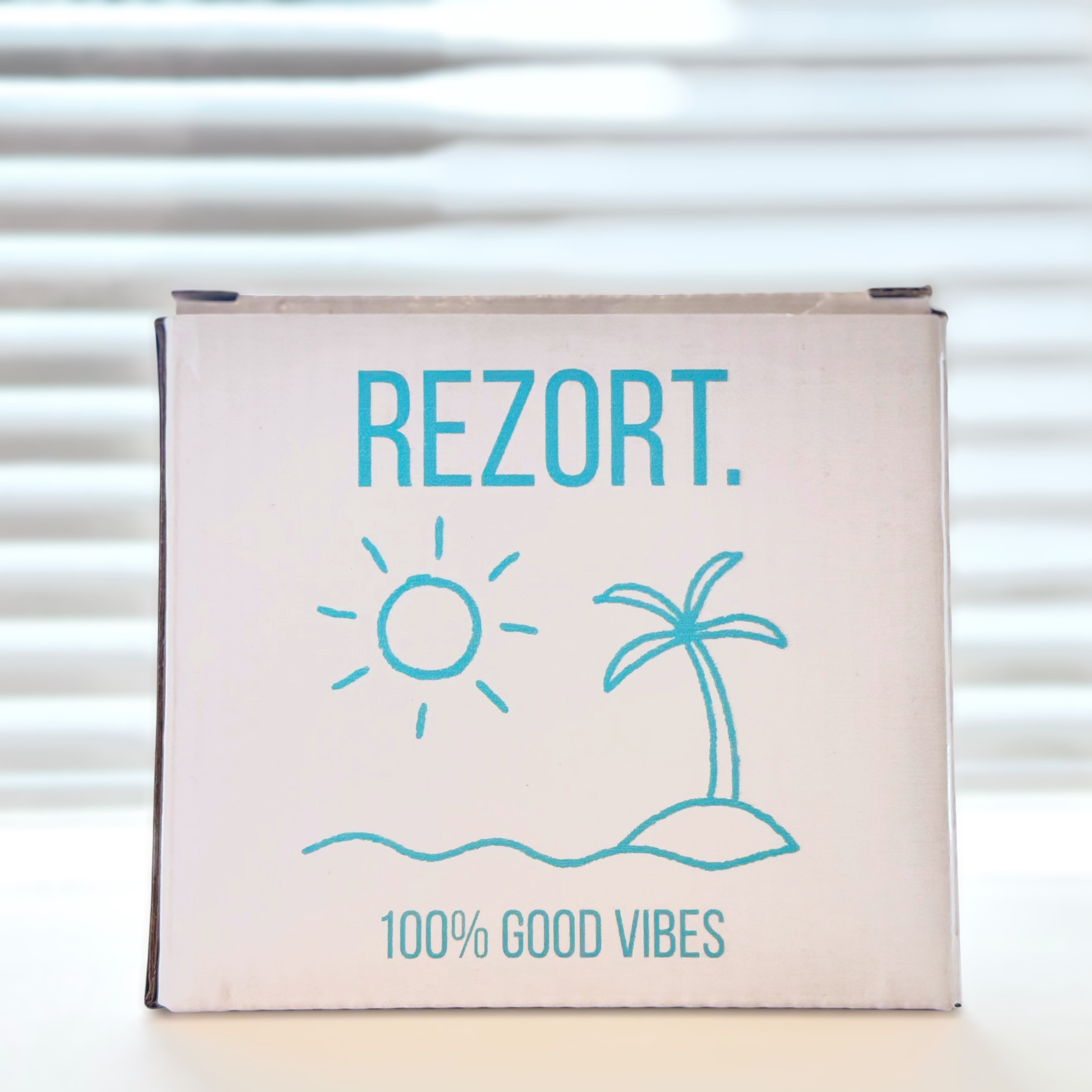 パールホワイトの余白を残したまま、REZORT.のグラデーションロゴをワンポイント。