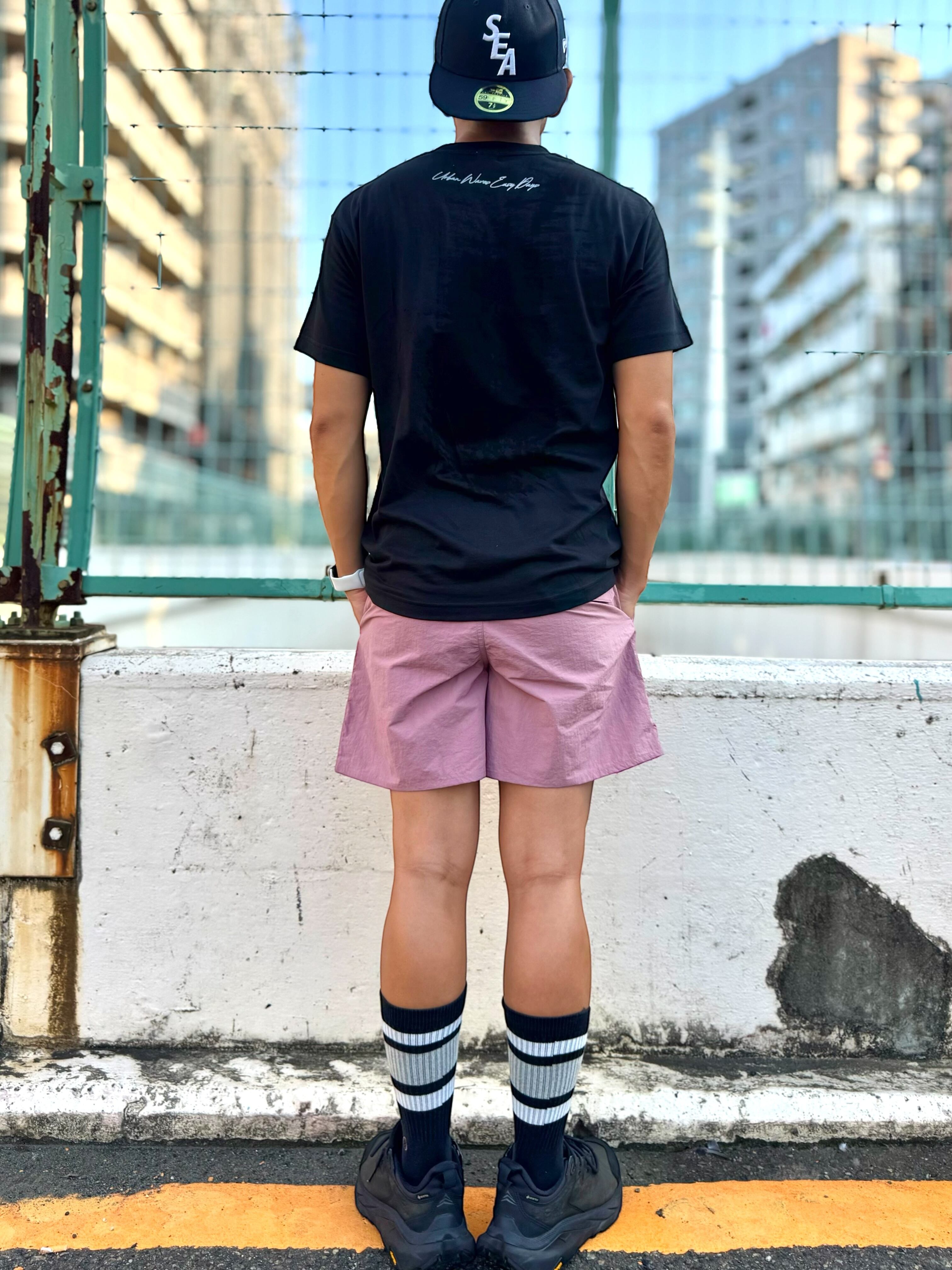 膝上の丈感は動きやすく、街穿きはもちろん、海や川などのアウトドアシーンや、フェスやジムでも場所を選ばず馴染んでくれる。
