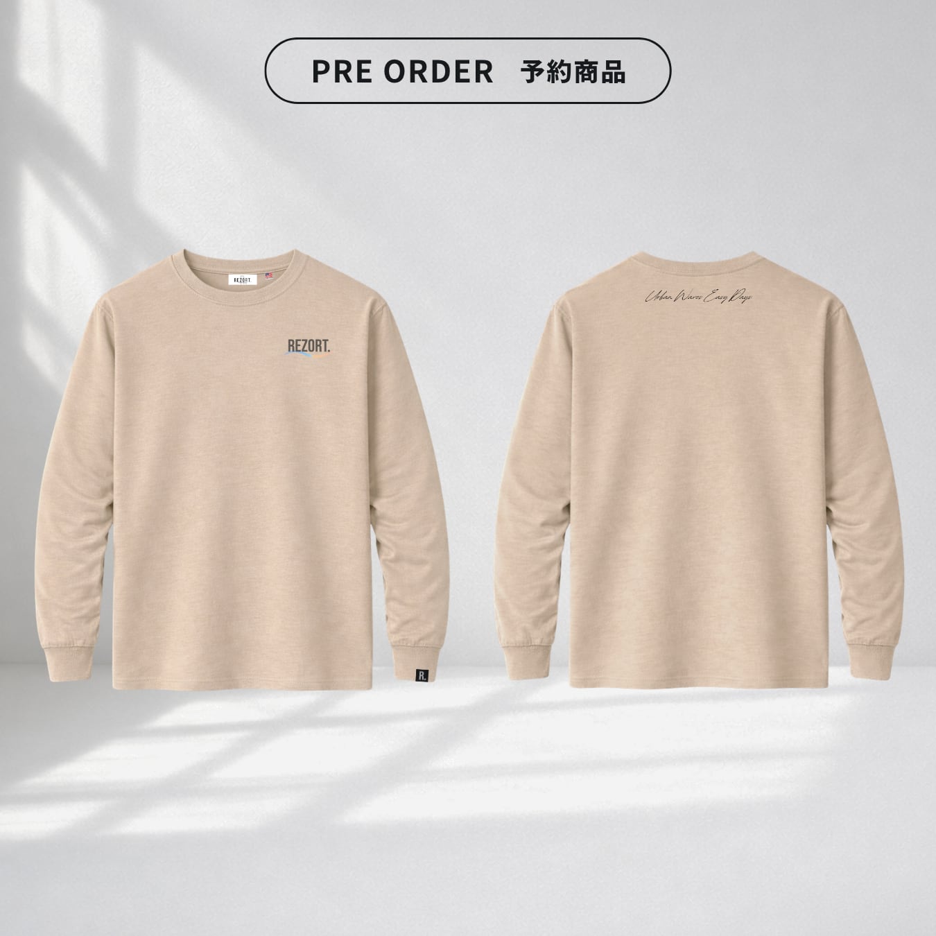 胸元にはREZORT.を象徴するWaveロゴ、首元にはコンセプトワード“Urban Waves Easy Days”の筆記体サイン。