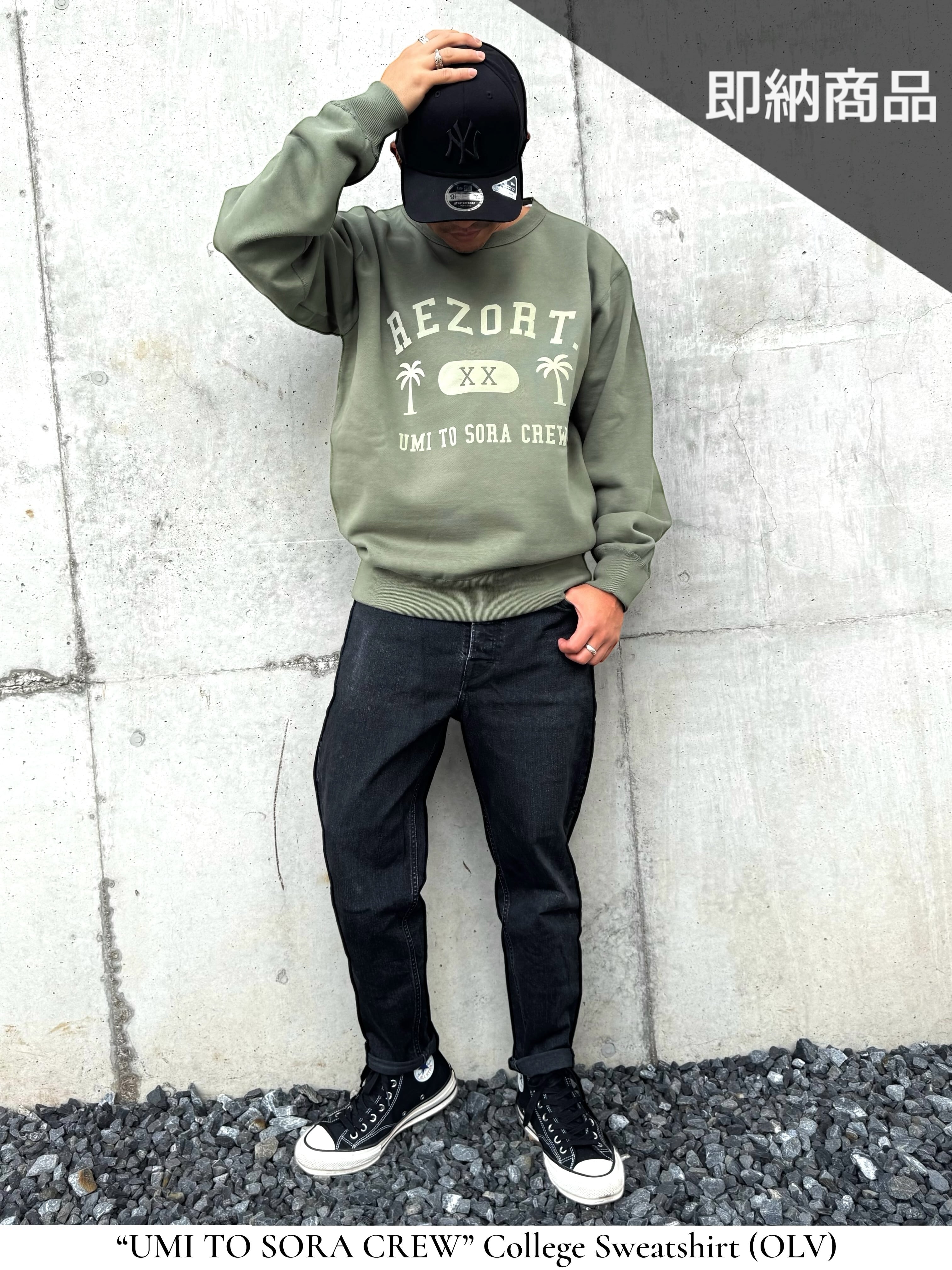 【即納/1点のみ/Olive/Lサイズ/撮影使用品】UMI TO SORA CREW” College Sweatshirt (OLV-FLOCKY) 12.4oz heavyweight - Winter Edition