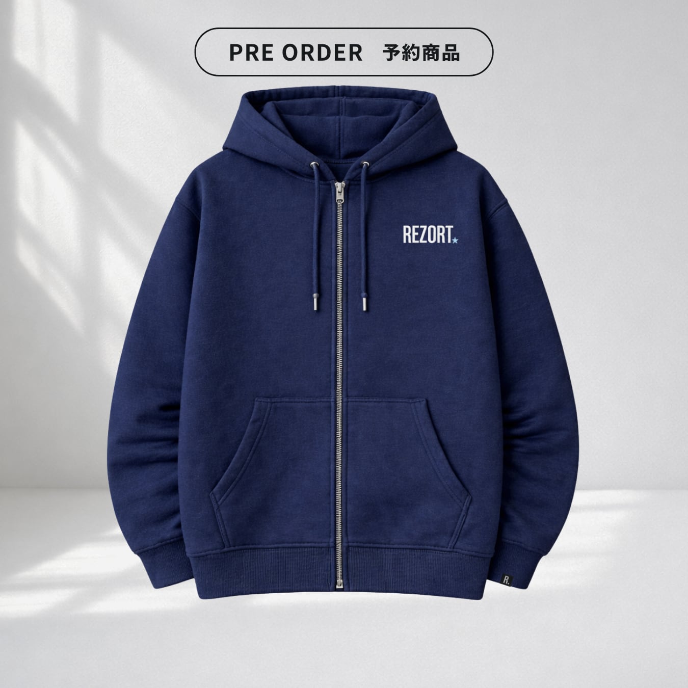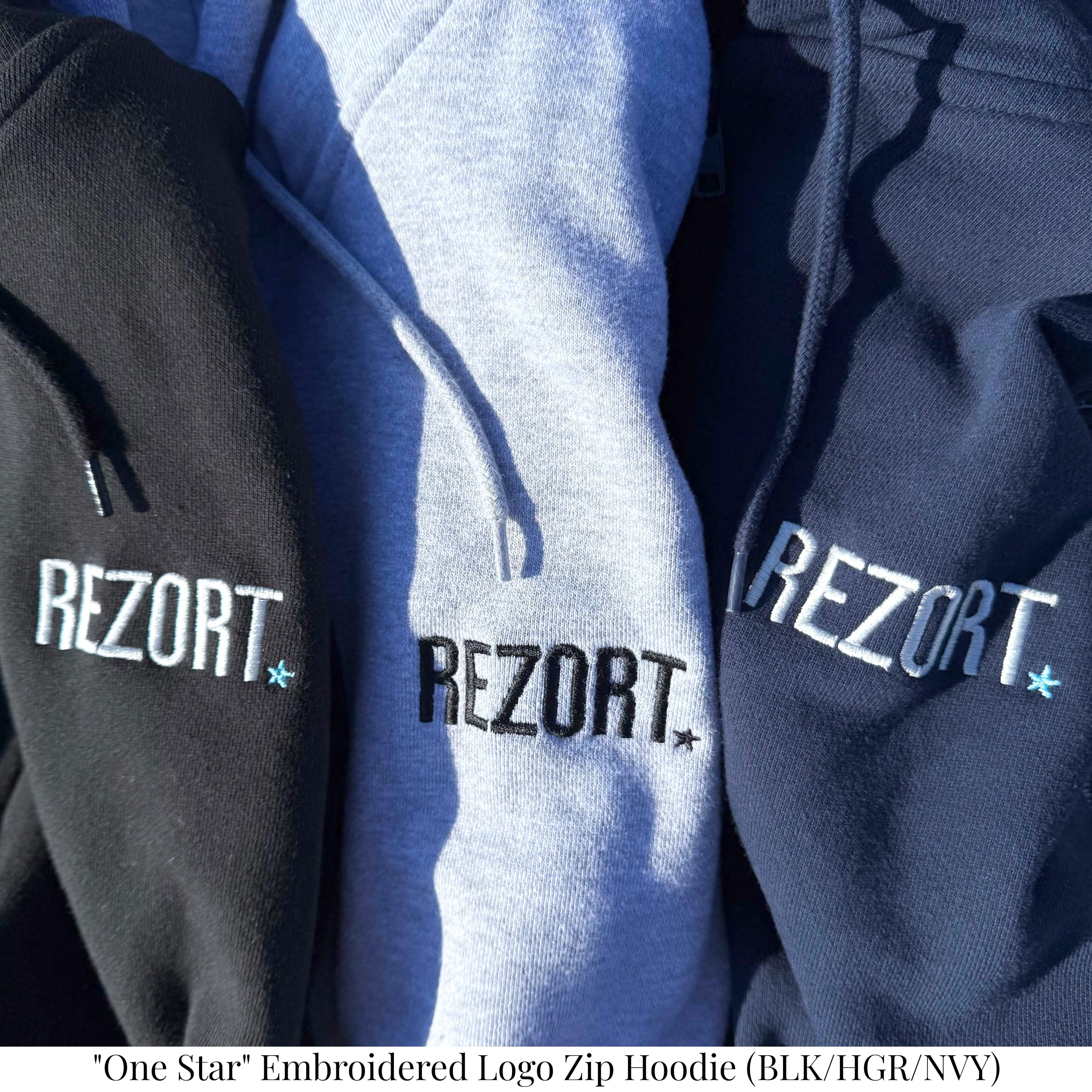 REZORT.のドットをブルーの星型に置き換えた、刺繍ロゴ。