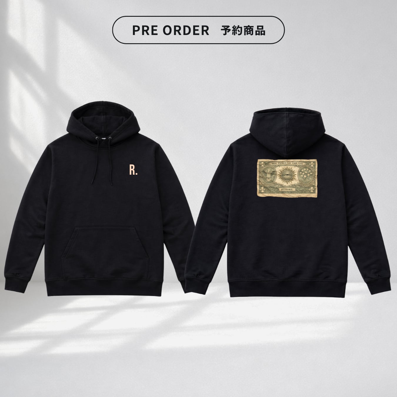 ミニマルデザインなフロントと、確実に記憶に残るバックデザインのコントラストが、このフーディの核。