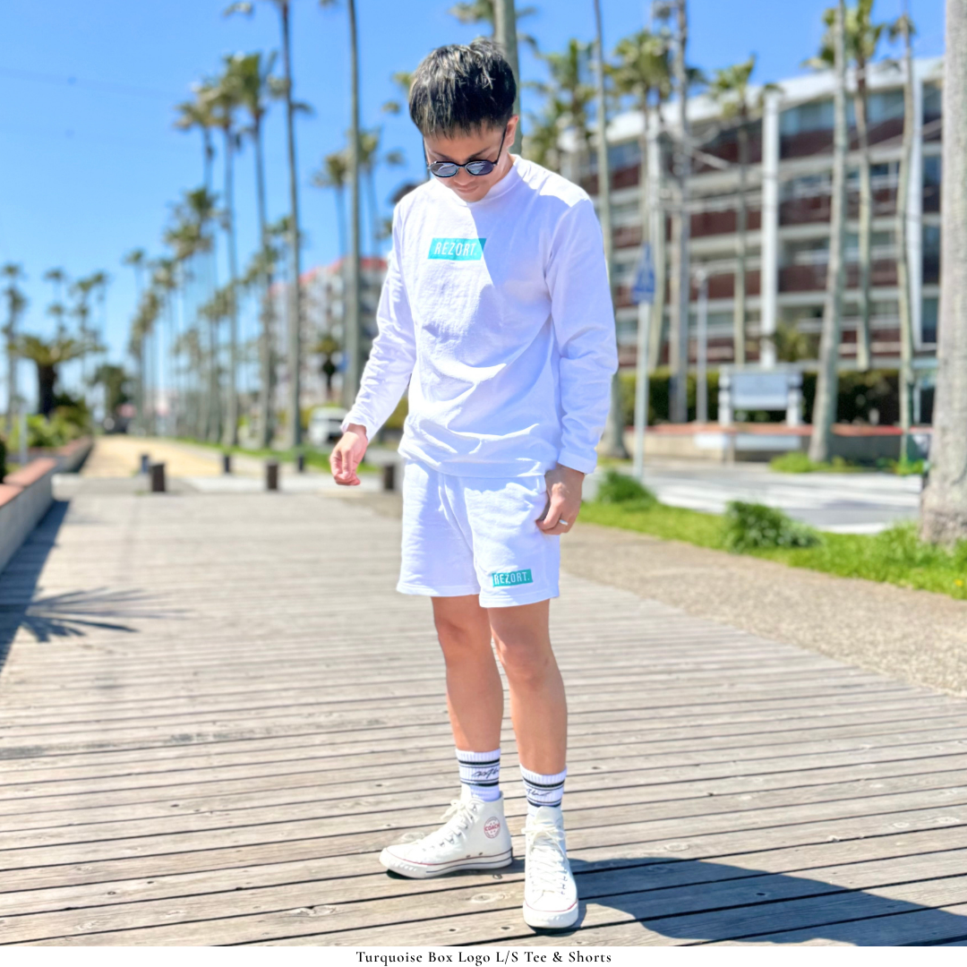 ブランドのシグネチャーであるターコイズBOXの中で、浮かび上がるREZORT.ロゴ。